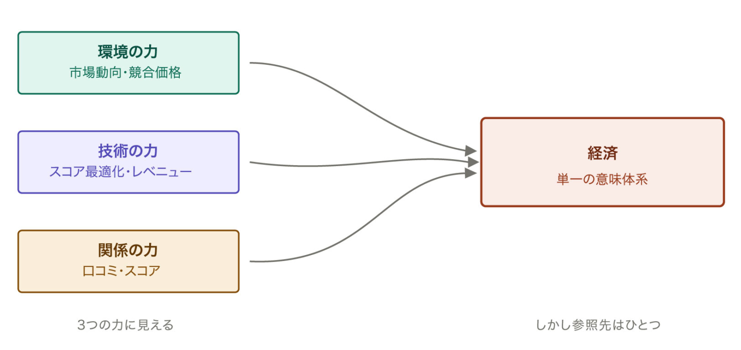 ところがOTAが環境の力・技術の力・関係の力であるかのように作動することで、知らず知らずのうちに、経済という単一の基準への応答に従事させられてしまう。環境の力に見えたものは市場への適応であり、技術の力に見えたものは経済的最適化への応答であり、関係の力に見えたものは数字を介した関係です。