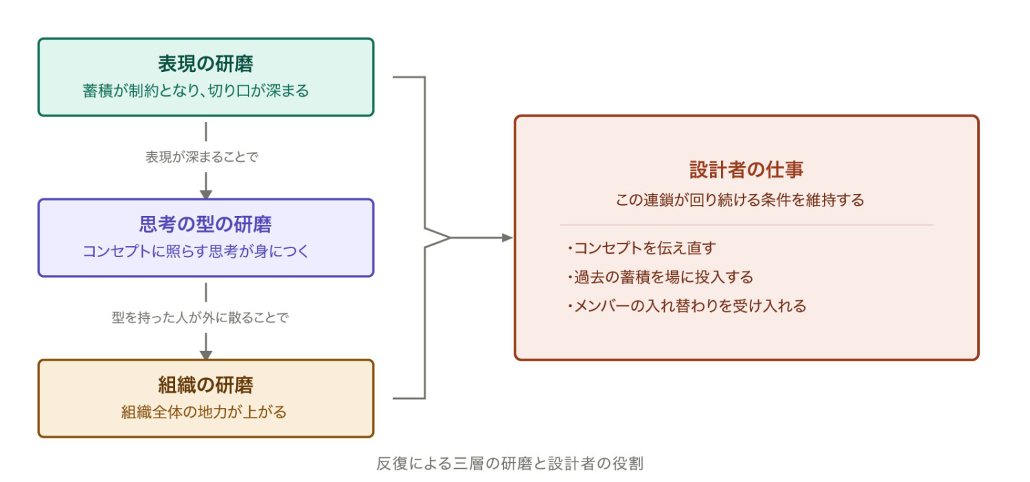 この3層は独立しているのではなく、連動しています。表現が深まるから思考の型が鍛えられ、型が身についた人が散るから組織が変わる。設計者の仕事は、この連鎖が回り続ける条件を維持することです。コンセプトを伝え直し、過去の蓄積を場に投入し、メンバーの入れ替わりを恐れずに受け入れる。派手な変化ではありませんが、8年間続けることで確実に地力は変わります。